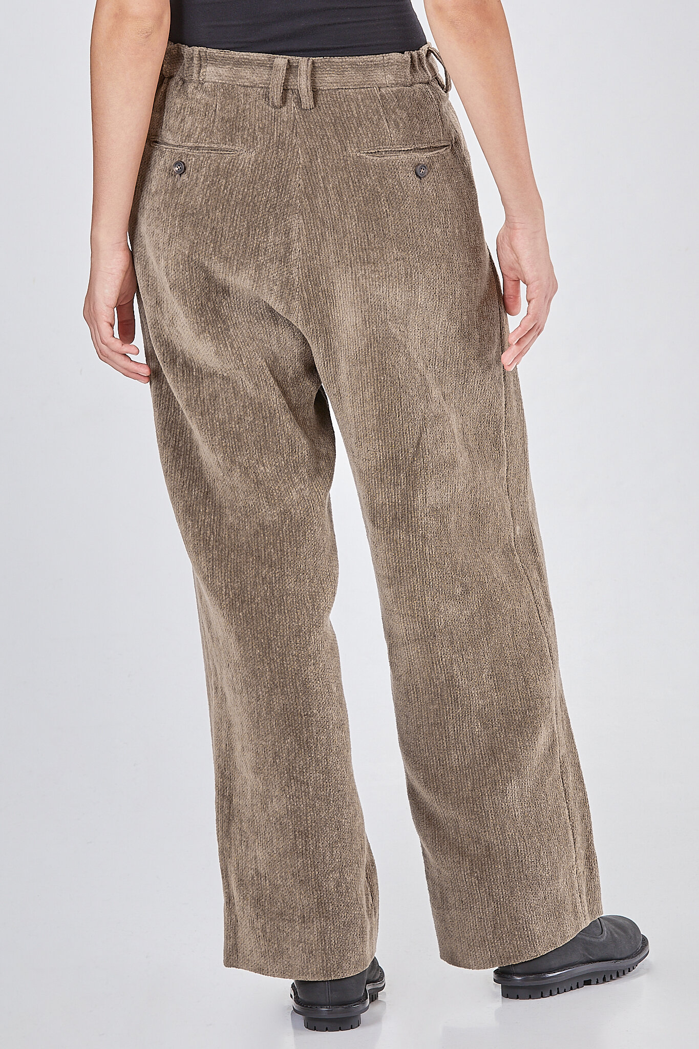 pantalone ampio, passanti per cintura, chiusura con zip e bottone, lunghe pinces verticali sul davanti, tasche a filo diagonali ai lati e orizzontali con bottoncino sul retro